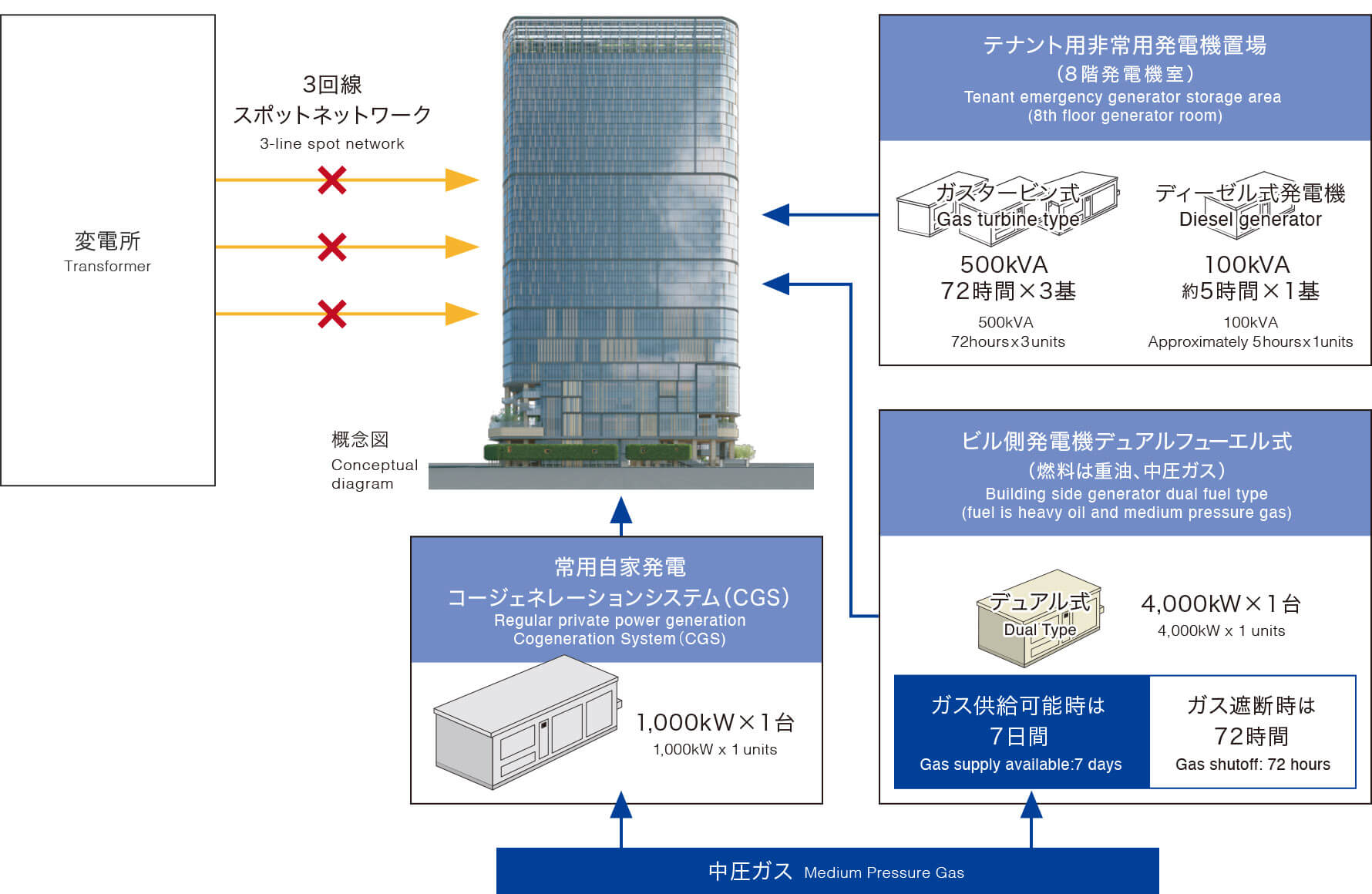 災害時、電力会社からの供給がストップした場合でもビル独自で、耐震性に優れた中圧ガスを燃料とするコージェネレーションシステムや非常用発電機などを活用した電力の供給が可能です。