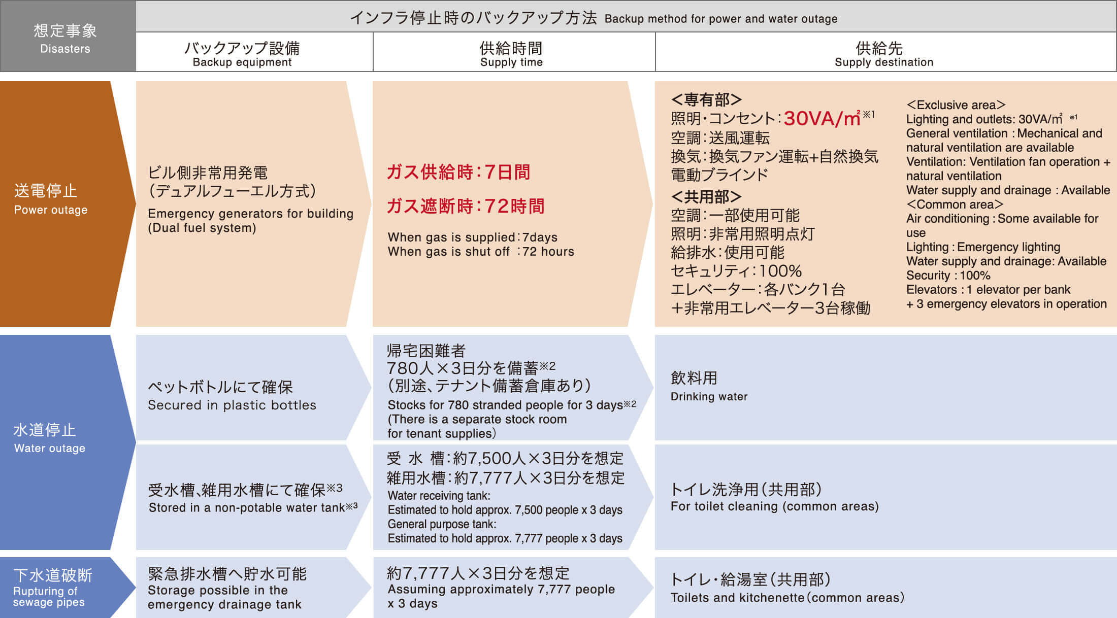 ※1 各区画分電盤まで実装 ※2 災害時の在館人数(帰宅困難者受け入れ人数 ※テナントは除く)想定より設定 ※3 雨水利用も併用